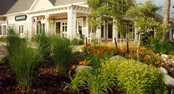 Kennedy Floral and Gifts sought a landscape design that would catch the eye of passing traffic as well as encourage customers to stroll through an intimate garden setting. Providing material for creative arrangements throughout the seasons was an additional request.
