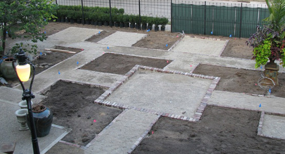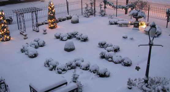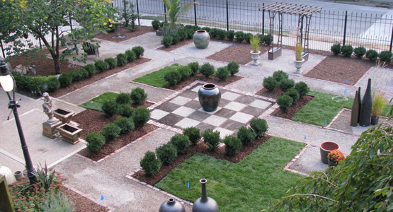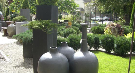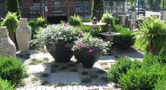Rooks chose to subdivide the site into a series of rooms. Framed by boxwood hedges, enhanced by beautiful plantings and peaceful water features, the garden encourages clients to enjoy a unique shopping experience.