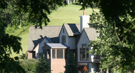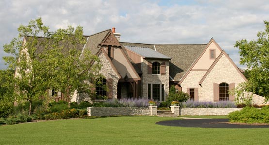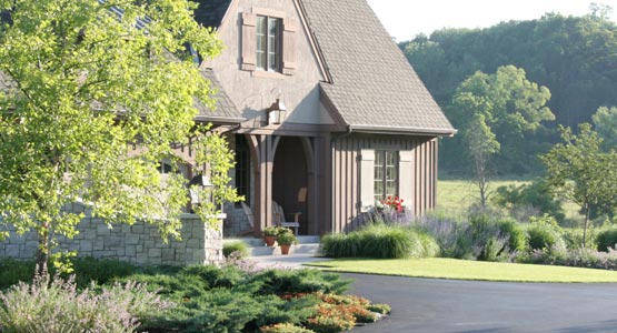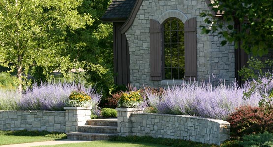 A wall was constructed incorporating the same stone found on the house, creating a raised entry terrace. The back patio, framed by a low-seating wall accommodates the family and invites everyone to enjoy the pastoral views.