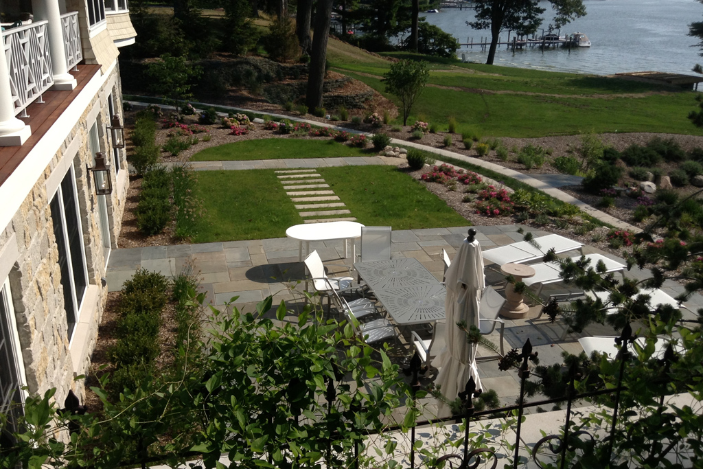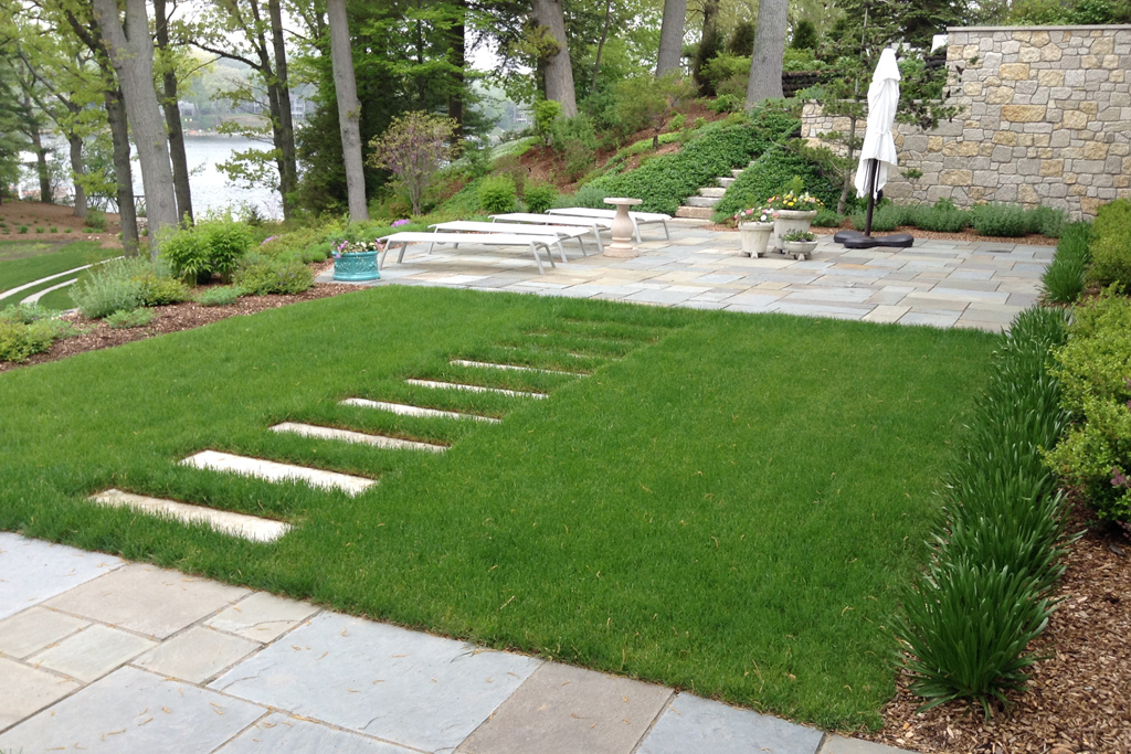 Built-in stepping stones across a lush green lawn meet a paver patio before walking up steps surrounded by cascading perennials.